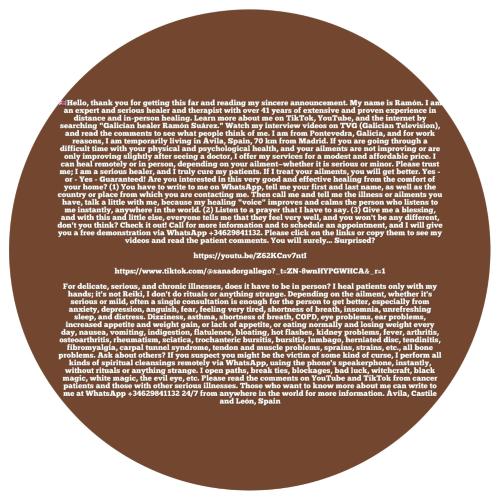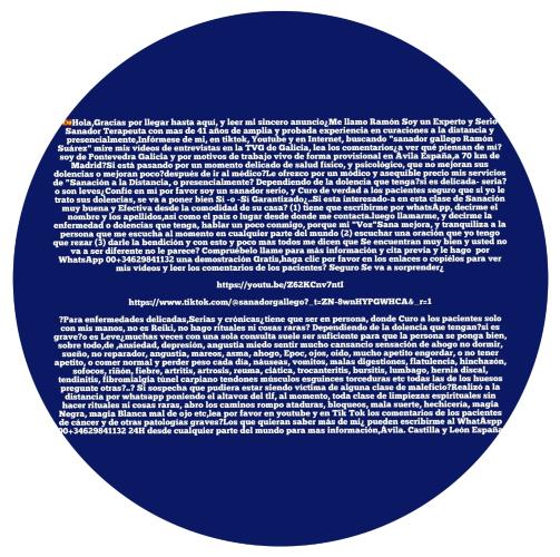 Hola,Gracias por llegar hasta aquí, y leer mi sincero anuncio¿Me llamo Ramón Soy un Experto y Serio Sanador Terapeuta con mas de 41 años de amplia y probada experiencia en curaciones a la distancia y presencialmente Infórmese de mi, en tiktok, Youtube y en Internet, buscando "sanador gallego Ramón Suárez" mire mis vídeos de entrevistas en la TVG de Galicia, lea los comentarios¿a ver qué piensan de mí?soy de Pontevedra Galicia y por motivos de trabajo vivo de forma provisional en Ávila España,a 70 km de Madrid?Si está pasando por un momento delicado de salud físico, y psicológico, que no mejoran sus dolencias o mejoran poco?después de ir al médico?Le ofrezco por un módico y asequible precio mis servicios de "Sanación a la Distancia, o presencialmente? Dependiendo de la dolencia que tenga?si es delicada- seria? o son leves¿Confíe en mí por favor soy un sanador serio, y Curo de verdad a los pacientes seguro que si yo le trato sus dolencias, se va a poner bien Sí -o -Sí Garantizado¿..Si esta interesado-a en esta clase de Sanación muy buena y Efectiva desde la comodidad de su casa? (1) tiene que escribirme por whatsÁpp, decirme el nombre y los apellidos,asi como el pais o lugar desde donde me contacta.luego llamarme, y decirme la enfermedad o dolencias que tenga, hablar un poco conmigo, porque mi "Voz"Sana mejora, y tranquiliza a la persona que me escucha al momento en cualquier parte del mundo (2) escuchar una oración que yo tengo que rezar (3) darle la bendición y con esto y poco mas todos me dicen que Se encuentran muy bien y usted no va a ser diferente no le parece? Compruébelo llame para más información y cita previa y le hago por WhatsApp 00+una demostración Gratis,haga clic por favor en los enlaces o copiélos para ver mis vídeos y leer los comentarios de los pacientes? Seguro Se va a sorprender¿