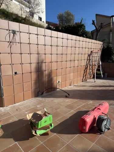 Trabajo de reconstrucción de muros para poner vallado, hacer caseta de obra para almacenaje de jardín. Vallar perímetro de la casa. Quitar jardineras y hacer suelo de cemento con piedra natural. Instalación de una cochera techada. Obra grande