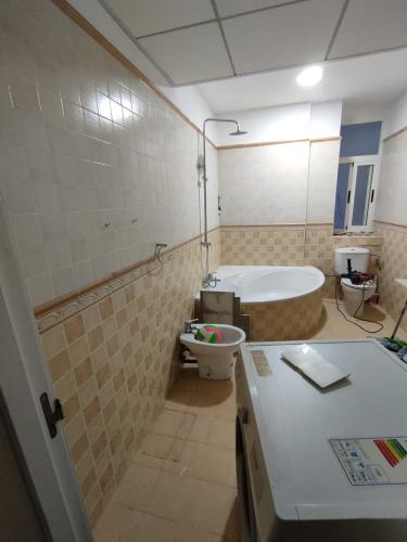 Hay que alicatar dos paredes, de unos 7m2, bajo de estas dos paredes está la piscina, pero en ella no hay que hacer nada, solo las dos paredes que menciono. Yo creo que es faena de dos días. Ya tenemos todo el material comprado, solo haría falta algo para cortar azulejos a la medida que sea necesario, el resto lo tenemos todo.