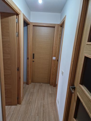 Se trata de una restauración de puerta de entrada con panelado interior blanco y de la colocación de marcos y puerta de un armario empotrado existente y presupuesto de 2 armarios empotrados nuevos de unos 3m de largo x 2,5m de alto cada uno así como colocación de rodapie (unos 3ml) en vigo