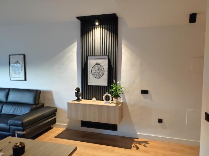 Le pedi a Marco el diseño y contrucción de una chimenea para instalar una eléctrica, que también sirviese de almacenamiento. En una semana ya tenía justo lo que quería. Perfeto.