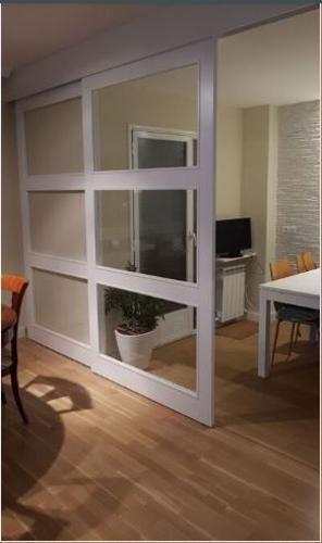 Quería cambiar tres puertas. Una de ellas es de doble hoja con ventana translucida. Lo que quería es poner una puerta sin ventana. La habitación antes era salón y ahora es la de los niños. Me gustaría q esta puerta tuviera, si puede ser, aislamiento acústico.