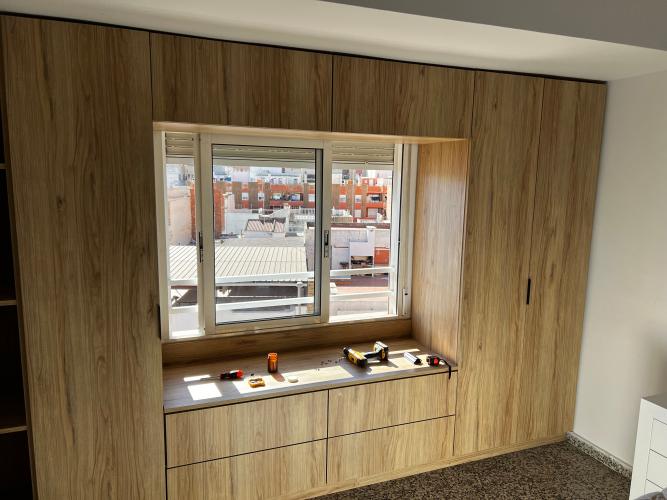 Me gustaría hacer dos armarios a medida en la habitación principal. Con la diferencia de uno con unos 10 cm menos de ancho porque no hay más hueco. Sería uno de 1'40 de ancho por 2'50 de alto por uno 50/60 de hondo y el otro igual pero sería 1'30 de ancho, ambos con 4 cajones abajo fuera de lo que es el armario y encima de ellos las puertas correderas.