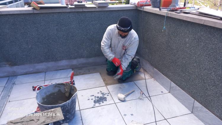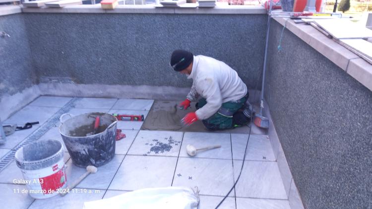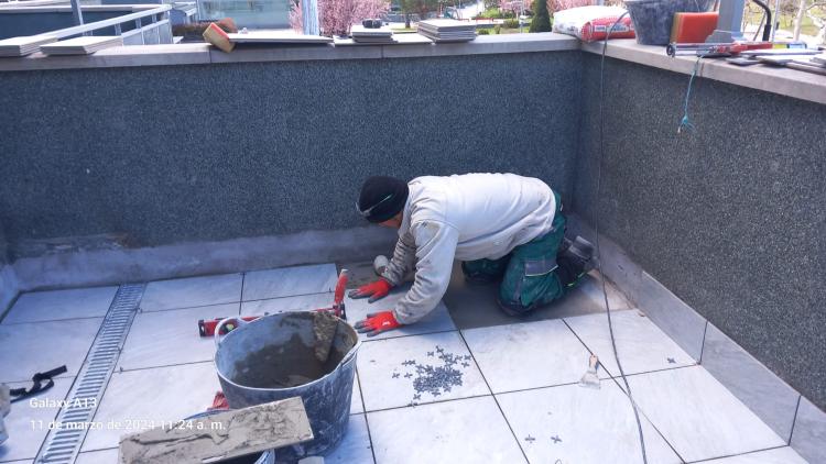 Tengo una terraza de unos 9m2 (3x3). Está en buen estado con baldosas de terraza tradicionales, pero da problemas de humedades en el piso inferior cuando hay lluvia por la zona del desagüe, y los peritos han determinado que hay filtraciones. Ahora mismo la zona está cubierta por baldosas de suelo pvc/madera flotante y cesped artificial y es bastante transitada. Contemplo hacer una...