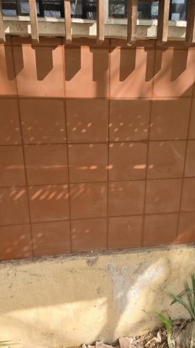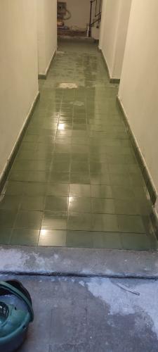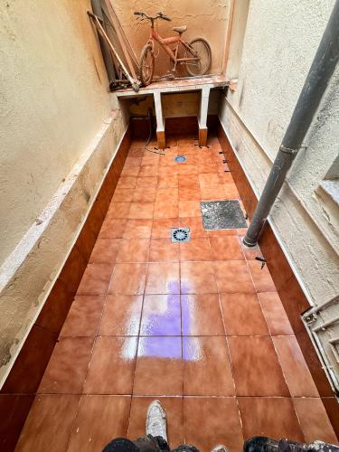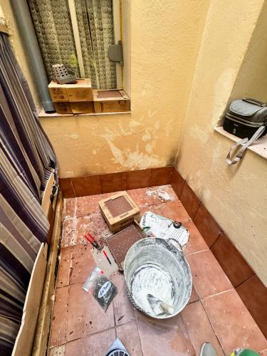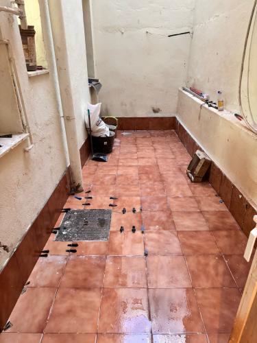 Es un patio se encuentra en el primer piso de la comunidad de propietarios, tiene 18 metros cuadrados. Habría que levantar las plaquetas actuales y el rodapié para poner una capa de impermeabilización y volver a solar el patio.