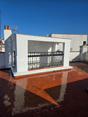 La terraza son unos 60 m2, incluyendo el zócalo rodapiés. Se forma un charco de 1 m2 que habría que corregir, y en los encuentros pared-suelo hay zonas que crece musgo.