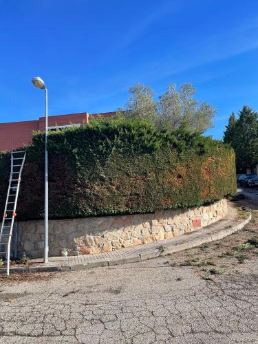Limpieza y poda de parcela de unos 120 metros cuadrados alrededor de vivienda pareada. Incluye entre otros, poda de hiedra en perímetro vivienda, recorte superior en varias arizonicas, rediseño de un laurel y eliminación de varios arbustos.