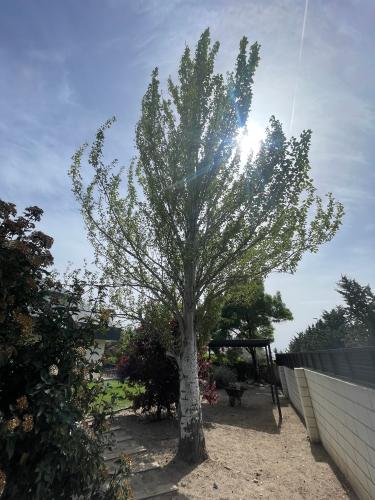 Parcela con parte solada y otra parte más pequeña con rosales y algún arbusto; no hay césped. Habría que desbrozarlo todo y limpiar. En dos de los pinos que tenemos se han quedado colgando unas ramas que habría que quitar, están como a 4 metros del suelo. También nos gustaría que nos aconsejaran sobre plantas que podríamos poner y qué tierra habría que echar a las alturas que estamos para...
