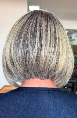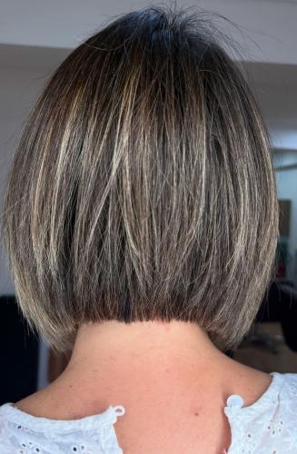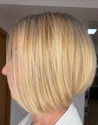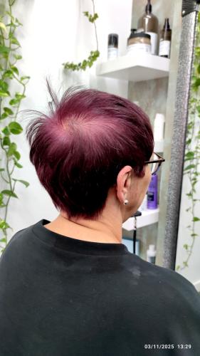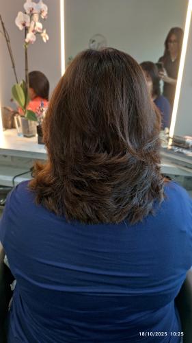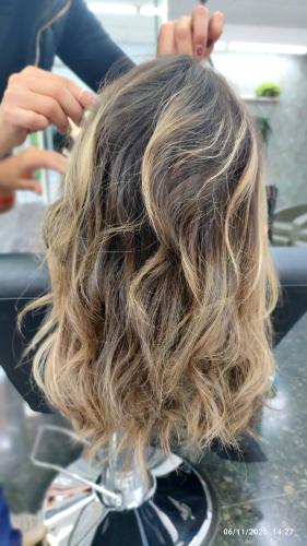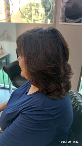 Pelo por debajo de los hombros. Tengo q alisarmelo porque ni se queda rizado ni liso. Mi pelo se bufa, creo q se dice así. Me tiñó cada 28 días tengo mucha cana.