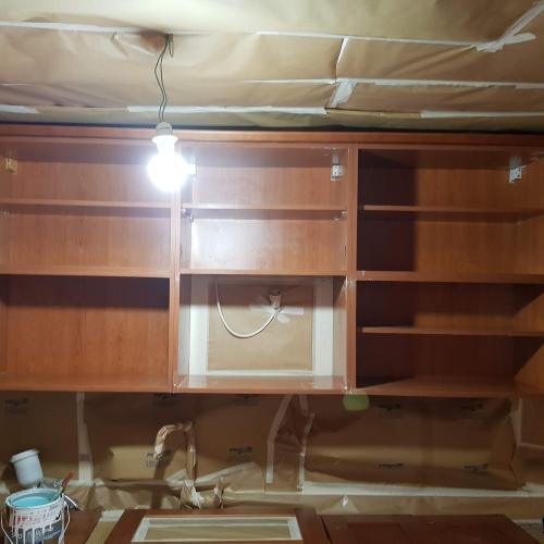 Vamos a cambiar muebles de la cocina y necesitamos pintar el techo. Es de escayola y tiene la pintura levantada en la zona de cocinado. Irán a reitrar los muebles de la parte superior para que pueda trabajar con comodidad y el trabajo quede bien.