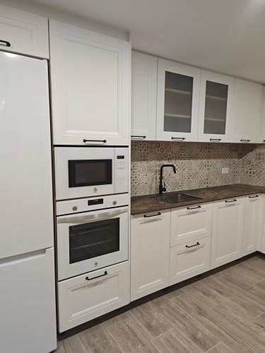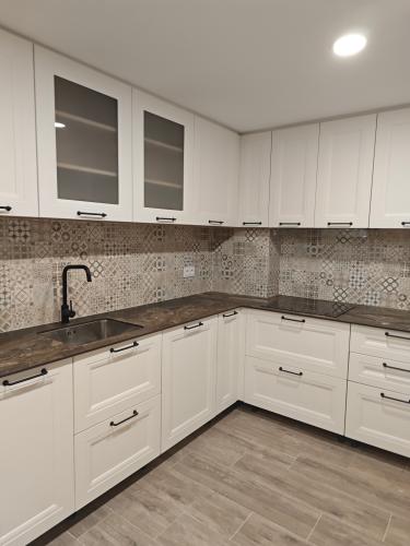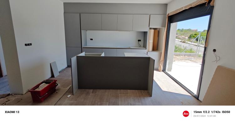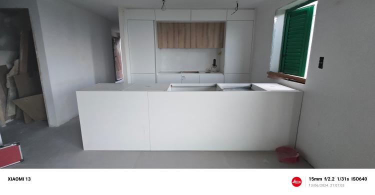 Colocar suelo cocina 10m© y colocar ventana pvc. Lavabo colocar ventana pvc y cerrar otra ventana de 80x100 de obra y colocar suelo 8m© tambien colocar azulejo alrededor de bañera 80cm. Cerrar con obra dos puertas. Reciclar azulejos en servicio, colocar suelo 3m©.