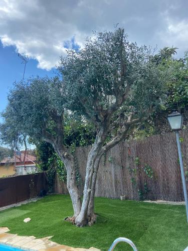 Es un pino que tiene ramas a punto de caer, una higuera y una morera que está inclinándose hacia el patio de la casa